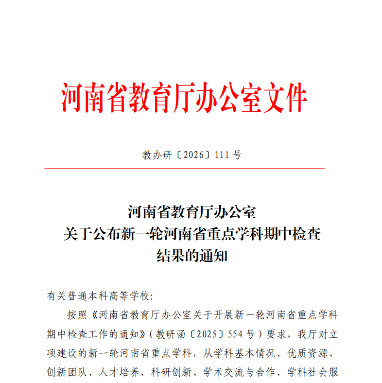 根据《河南省教育厅办公室关于公布新一轮河南省重点学科期中检查结果的通知》(教办研〔2026〕111号),教育厅从学科基本情况、优质资源、创新团队、人才培养、科研创新等方面对建设学科期中目标达成情况和标志性成果质量与水平进行了全面评价,韩国av